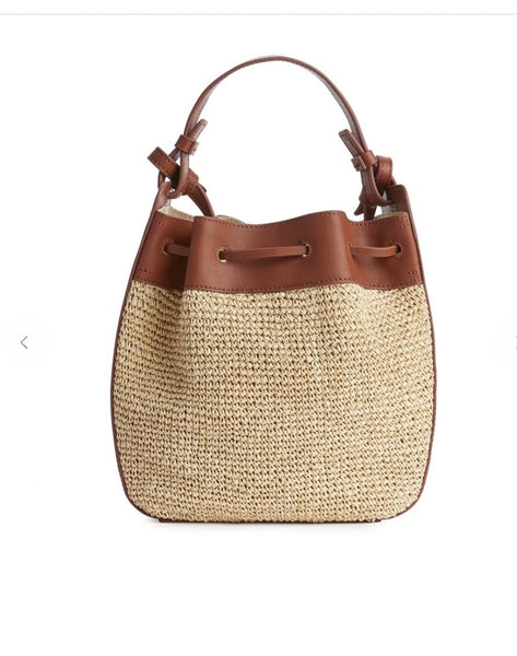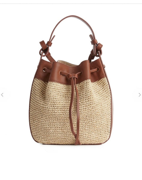 A small bucket bag made from crocheted paper straw, detailed with leather trimmings and a drawstring. The bag features a top handle and a detachable shoulder strap. The inner compartment is divided in two, by a pocket with zip closure.
