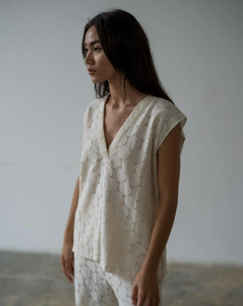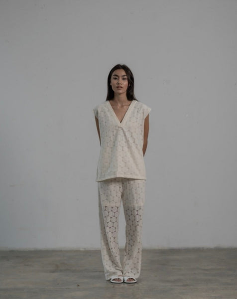 neck loose sleeveless top paired with high-waist elastic pants (with pockets)